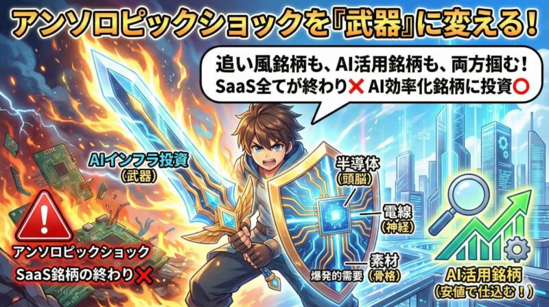 この記事では、アンソロピック・ショックの全貌をわかりやすく解説したうえで、半導体株・電線株・素材株のおすすめ銘柄を合計13銘柄、比較テーブル付きで徹底解説します。さらに、投資スタイル別のポートフォリオパターンもご紹介するので、読み終わる頃には「自分に合った銘柄」が見えてくるはずです。