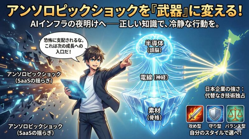 - アンソロピック・ショックの本質:「SaaSの終わり」ではなく「AIインフラの夜明け」。Claude CoworkはSaaS企業のビジネスモデルを揺るがしたが、その裏側ではAIを動かすための半導体・電線・素材の需要が爆発的に拡大している。