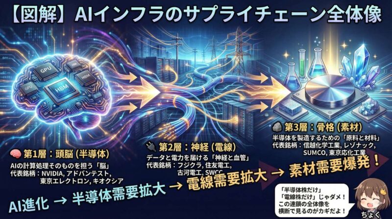 AIが進化する → もっと高性能な半導体(第1層)が必要になる → それを処理するデータセンターに大量の電線(第2層)が必要になる → そして半導体を作るための素材(第3層)の需要も爆発する。