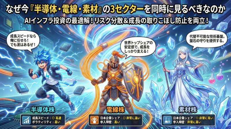 - 3セクターはサプライチェーンで繋がっている:半導体(頭脳)→ 電線(神経)→ 素材(骨格)の3層構造でAIインフラを形成。1つのセクターだけでなく、3つを横断的に見ることで、成長の取りこぼしを防ぎながらリスク分散できる。