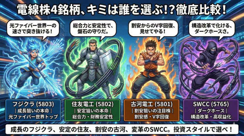 電線株の中では住友電工が相対的に配当利回りが安定しています。ただし、電線セクター全体としてはキャピタルゲイン(値上がり益)を狙う投資が主流です。高配当目的であれば、他のセクターの高配当銘柄と組み合わせたポートフォリオ構築をおすすめします。