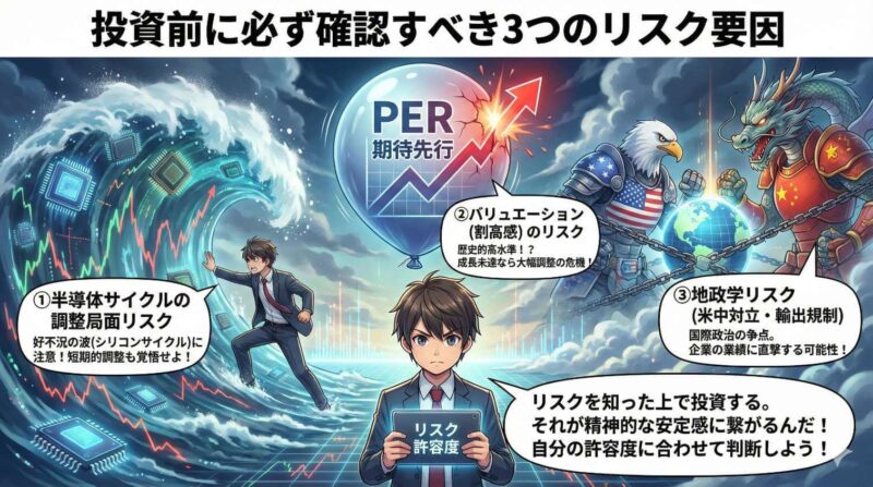 AIインフラ需要の拡大は構造的なトレンドであり、単なるバブルとは性質が異なります。ただし、個別銘柄のバリュエーション(PER等)が過度に高くなっている場合は、短期的な調整リスクがあります。「業界全体は成長するが、個別銘柄の株価にはサイクルがある」と考え、投資タイミングと分散を意識することが重要です。