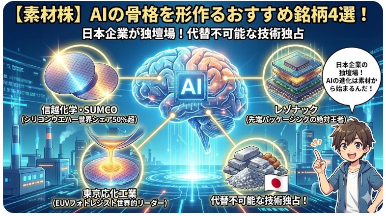 一概には言えませんが、半導体の「設計・GPU」分野では米国株(NVIDIA、AMD)が圧倒的、一方で「装置・素材・電線」分野では日本株が世界トップクラスのシェアを持っています。為替リスクも考慮した上で、両方をバランスよく持つことが理想的です。日本株のみで始めたい場合は、本記事で紹介した日本企業だけでも十分に質の高いポートフォリオを構築できます。