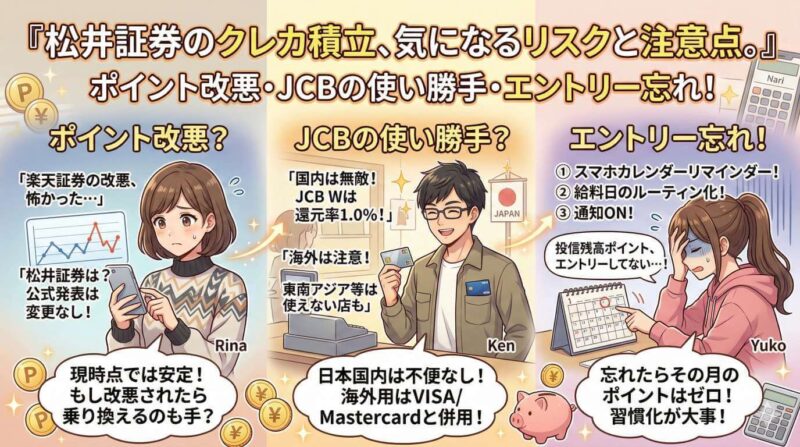 松井証券はどうかっていうと、2026年1月のOki DokiポイントからJ-POINTへのリニューアルでも、クレカ積立の還元率や進呈条件に変更はないと公式に発表している。投信残高ポイントサービスも2024年のリニューアル以降、安定して運用されている。