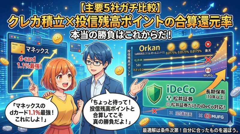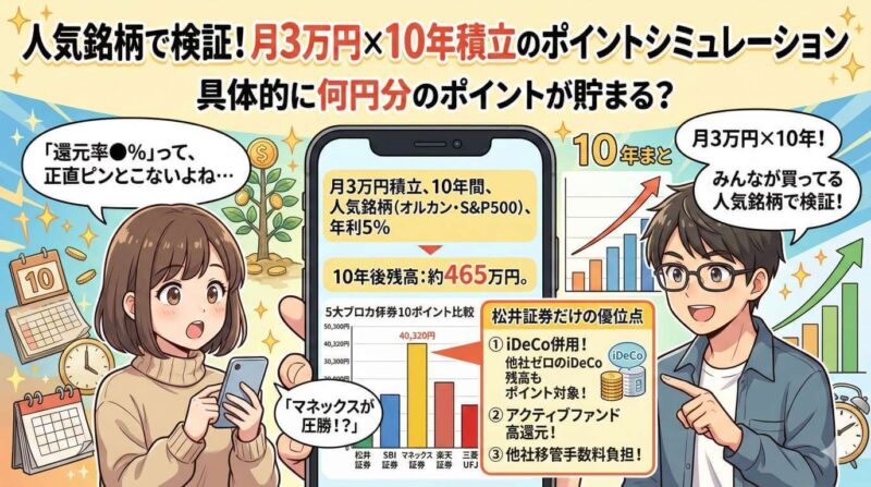 この記事では、松井証券のクレカ積立と投信残高ポイントサービスを主要5社と本気で横断比較する。しかも「還元率●%」みたいな抽象的な話じゃなく、人気銘柄で月3万円×10年積立したら何円分のポイント差がつくかまで、具体的にシミュレーションしてみた。