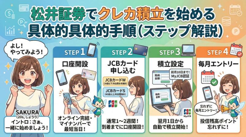 口座を開設 → JCBカードを申込 → 積立設定 → エントリー。