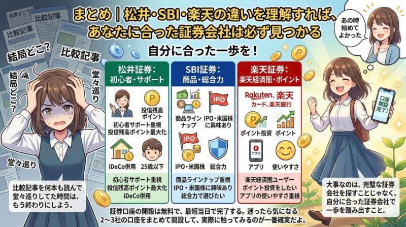 まとめ|松井証券・SBI・楽天の違いを理解すれば、あなたに合った証券会社は必ず見つかる
