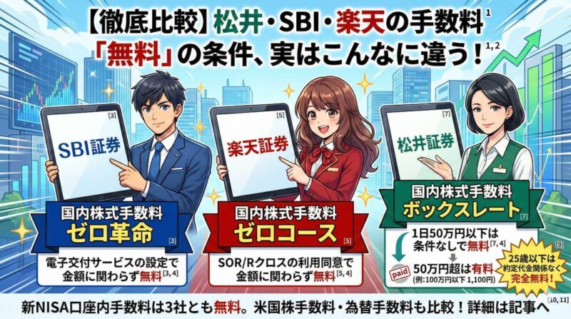 この記事では、松井証券・SBI証券・楽天証券の3社を「手数料」「ポイント還元」「NISA対応」「サポート」「ツール」の5つの軸で徹底比較する。