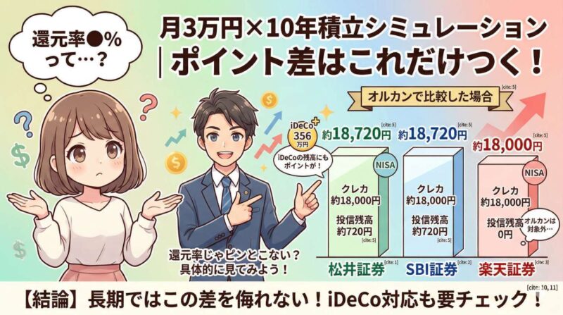 しかも「還元率●%」みたいな抽象的な話じゃなく、月3万円×10年積立でどれだけ差がつくかまで、具体的にシミュレーションしてみた。