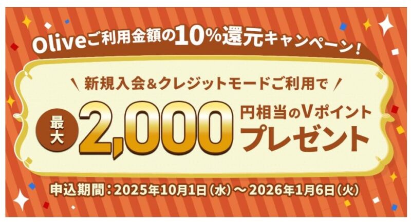 | Oliveスマートタッチプラン +クレジットモードの利用金額10%還元キャンペーン | 最7,000円分のVポイントPayギフト +最大2,000円相当のVポイント | 2025年10月1日(水)~2026年1月6日(火) |