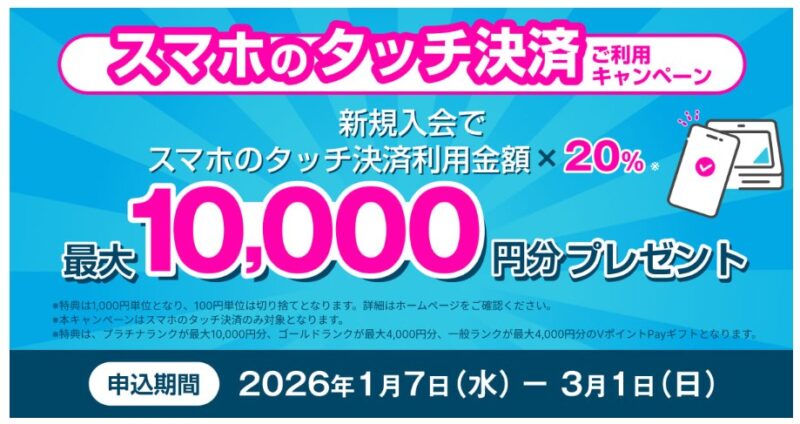 | スマホのタッチ決済ご利用キャンペーン | 最大10,000円相当のVポイントPayギフトプレゼント | 2026年1月7日(水)~2026年3月1日(日) |