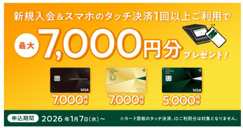 | 【条件】 以下の条件すべてを満たした本会員 1.期間中に、対象カードに新規でご入会(※1) ※1 カードのご入会日は「WEB明細書」または「カードをお届け時の台紙」でご確認いただけます。 2.カード入会月+1ヵ月後末までに、新規でご入会した対象カードでスマホのVisaのタッチ決済・Mastercardタッチ決済をご利用 【対象とならない条件】 ・対象カードお申し込み月+1ヵ月後末までに入会完了されない場合。 ・2025年12月31日(水)時点で弊社が指定するカード(注)をお持ちの方 ・2021年2月1日(月)以降、新規で弊社が指定するカード(注)を発行した履歴がある方 【(注)指定カード一覧】 Oliveフレキシブルペイ プラチナプリファード(クレジットモード) 三井住友カード プラチナ 三井住友カード プラチナプリファード Oliveフレキシブルペイ ゴールド(クレジットモード) 三井住友カード ゴールド(NL) 三井住友カード ゴールド 三井住友カードゴールドVISA(SMBC) 三井住友カード プライムゴールド 三井住友カードプライムゴールドVISA(SMBC) 三井住友カード ヤングゴールド Oliveフレキシブルペイ(クレジットモード) 三井住友カード(NL) 三井住友カード(CL) 三井住友カード(旧名称:三井住友カード クラシック) 三井住友カード デビュープラス 三井住友カード RevoStyle 三井住友カードVISA(SMBC) 三井住友銀行キャッシュカード一体型 三井住友カード A(旧名称:三井住友カード クラシックA) 三井住友カード アミティエ 三井住友カード エグゼクティブ 三井住友カード エブリプラス 三井住友 ブラッサムカード (PA-TYPE含む) |