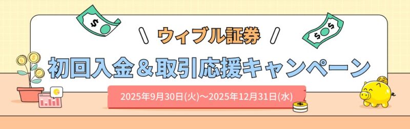 | ウィブル証券、初回入金&取引応援キャンペーン | 現金1,000円プレゼント | 2025年9月30日(火)17時00分-2025年12月31日(水)16時59分 |