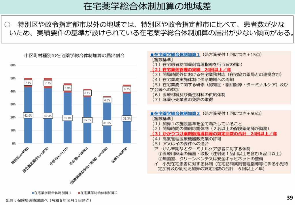 在宅医療への積極的な貢献を評価する在宅薬学総合体制加算についても、特別区や政令指定都市以外の地域では届出が少ない傾向があります。