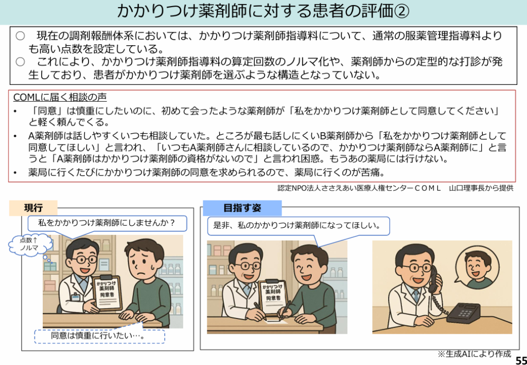 「初めて会った薬剤師に同意を求められる」といった患者からの声も寄せられており、患者が安心して医療サービスを受けられる環境が損なわれている可能性があります。