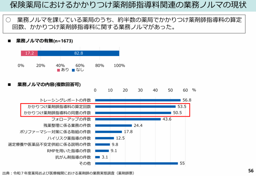 この高い点数が設定されている結果、患者が自らの意思で選択すべきかかりつけ薬剤師について、薬局側から同意取得数や算定回数に関する業務ノルマが課されている薬局が約半数存在している現状が明らかになりました。