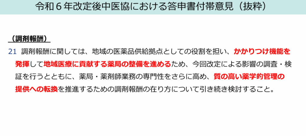 また、特別調剤基本料Aを算定している薬局グループ全体に一律の減算措置を適用する、いわゆるグループ減算についても、引き続き検討するよう附帯意見が残されており、敷地内薬局問題の改善が見られない場合、あらゆる措置が検討される可能性があります。
