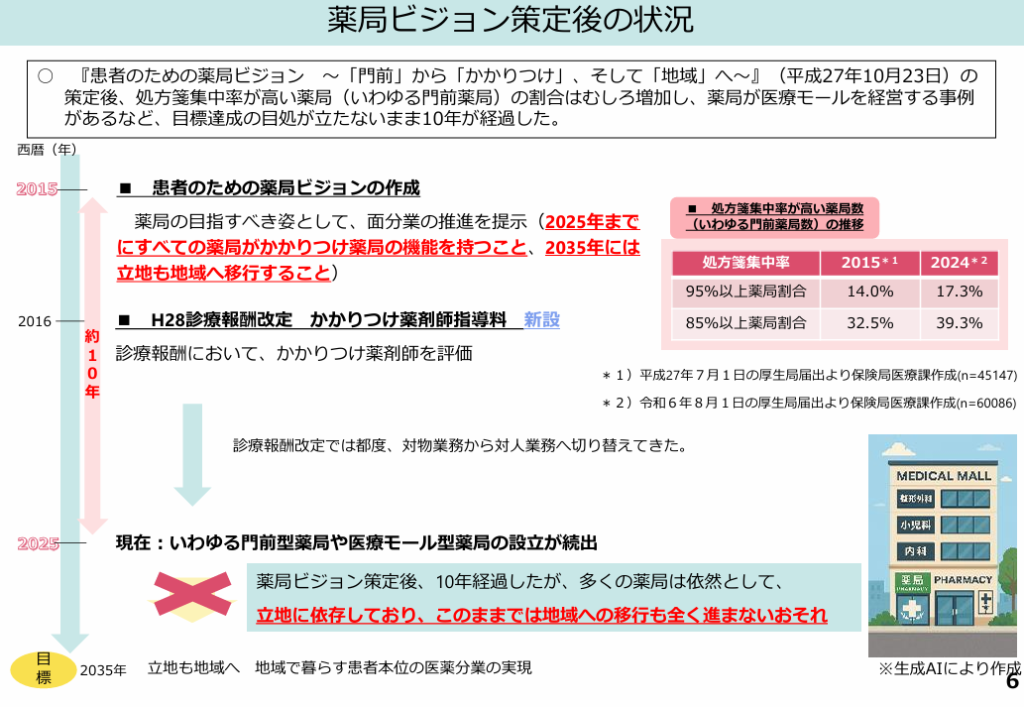 いわゆる門前薬局(処方箋集中率が高い薬局)の割合はむしろ増加しており、目標達成の目途が立っていません・・・
