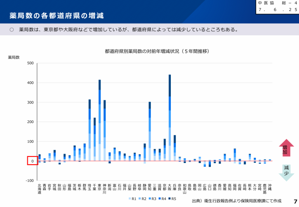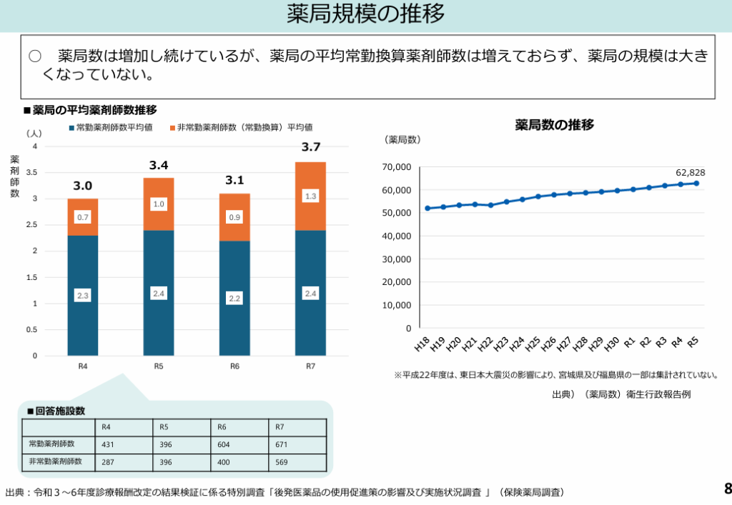 都市部では、十分な機能を持たない小規模な薬局が乱立し、処方箋受付枚数の減少や医薬品流通の非効率化、ひいてはかかりつけ薬剤師機能の脆弱化を招いているとの指摘があります。