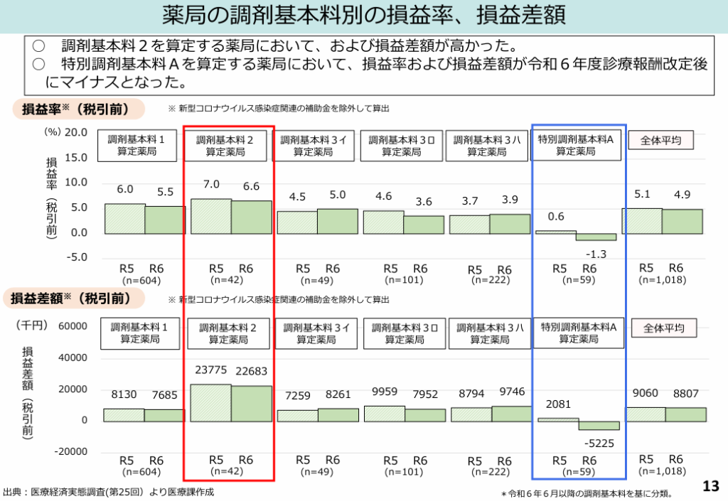 いわゆる同一敷地内薬局を対象とする特別調剤基本料Aは、令和6年度改定後に損益率および損益差額がマイナスに転じています。