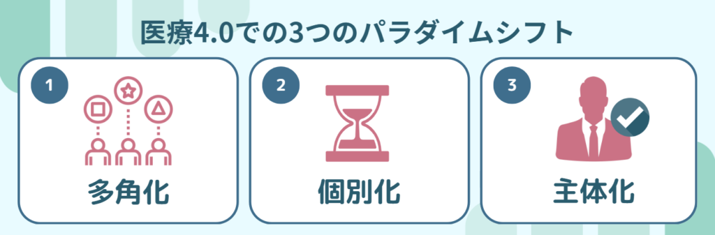 著者の加藤氏は、テクノロジーによって「医療4.0」の世界が「多角化」「個別化」「主体化」の3軸で進化すると定義していますので、解説していきます!