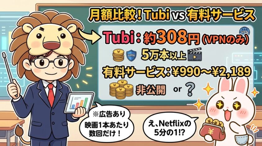 - かかる費用はVPN代(月額約300円〜400円台)のみ。Tubi自体は完全無料