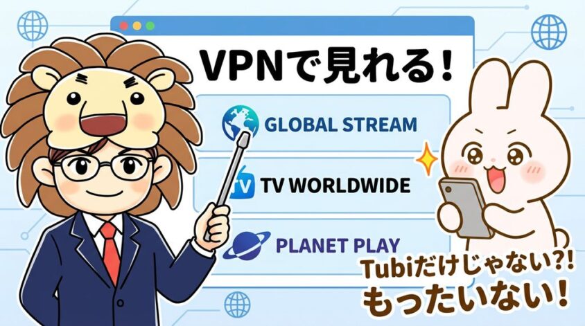 | Tubi + VPN | 約308円〜 (VPN代のみ) | 50,000本以上 | あり |